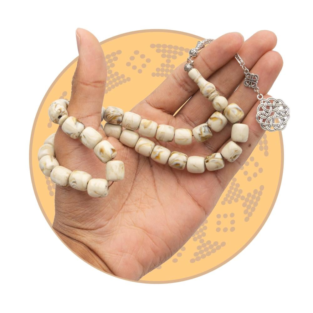 تتميز سبحة طربزونة فخمة بحباتها ذات الشكل المكعب والألوان البيج مع لمسات بنية رقيقة تنضح بالأناقة والبساطة في آنٍ واحد، كما أنه تم تصميم المسبحة بعناية لتعكس جودة عالية ومتانة ملحوظة، مع إضافة تصميم معدني مميز يمنحها طابع تقليدي مع لمسة عصرية تناسب الذوق العصري.