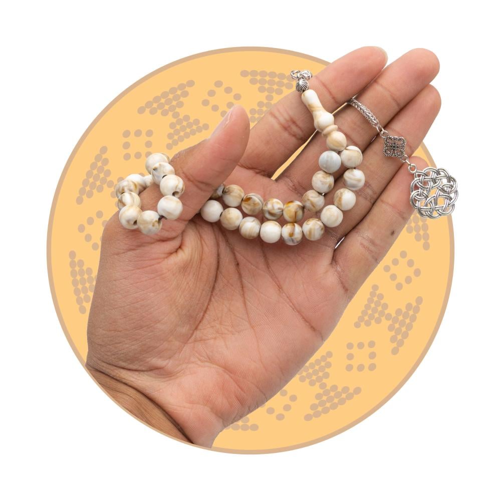 - مزيج الألوان بين البني الدافئ والأبيض النقي يعزز من جمالية التصميم ويمنح السبحة طابع طبيعي وأنيق.